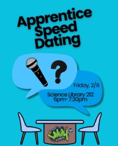 Come join us for Apprentice Speed Dating on Friday in SL 212! Get ready to meet your fellow apprentices/station members and get to know each other!