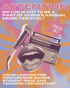 HEY MOESTERS. Do you have a talent you wish to share with the world? Part of a band? Want to get the word out about your student organization? Or sell your wares? You have the special chance to do just that at WHRW’s event of the year: Moefest! Check out our linktree and fill out the form if you’re interested in performing or tabling! 🎸🎶